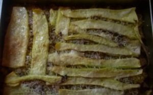 Egy 20×25 tepsit a félretett szalonna zsírjával vékonyan megkenjük, a cukkini csíkokkal kibéleljük, egyenletesen elosztjuk rajta a ragut, és betakarjuk a megmaradt cukkini csíkokkal. A tetejét meglocsoljuk a szalonna zsírjával, 200 fokos sütőbe félóráig sütjük. Csak alsó sütéssel süssük, vagy takarjuk le a tetejét fóliával, mert a felső cukkini csíkok kiszáradhatnak. Ha megsült, megszórjuk reszelt sajttal, és csak annyira toljuk vissza, hogy a sajt ráolvadjon.