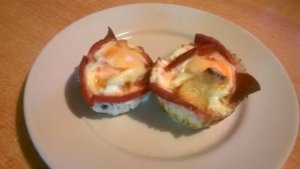 A muffin formát a kocka füstölt szalonnával, körbe dörzsöljük, vagy kibéleljük muffin kapszulával. A füstölt szalonnát a forma aljára tesszük, a gépsonkát nagyobb kockára vágjuk, és a muffin forma oldalához igazítjuk, úgy, hogy egy kicsit az aljára is jusson, bele ütjük a tojást, és 180 fokon tíz perc alatt megsütjük, ekkor rátesszük a reszelt sajtot, és még egy- két percre vissza tesszük amíg a sajt rá olvad. Kínálhatjuk friss kenyérrel, de főzelékre feltétnek is kiváló, vagy akár a hidegtál része is lehet.