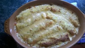 Egy közepes sütőtál aljára teszünk három kanál szaftot, amit jól elsimítunk. A palacsintákat megtöltjük a húsos masszával, két szembe szélét kicsit felhajtjuk, és feltekerjük, mint egy kis batyut. Szorosan egymás mellé fektetjük a sütőtálba, és a maradék szaftot rá kanalazzuk. 200 fokos sütőbe 10percig sütjük.