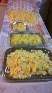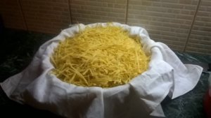a kész tésztát, rögtön ki is főzhetjük, de meleg helyen, mostanában napon, csörgősre szárítva, konyharuhába, vagy textil zsákba tárolhatjuk. Én fontam magamnak papírból kis kosarat, azt bélelem ki egy kisebb terítővel, és abba pihen a szárított tészta a felhasználásig.