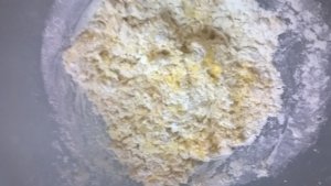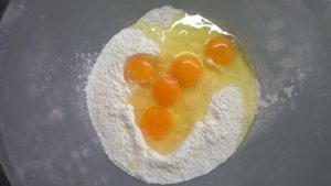 A lisztet tálba szitáljuk, beleütjük a tojásokat. A tojásokat, külön is leüthetjük, és jól elkeverve adjuk a liszthez.