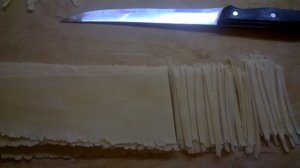 Amikor eléggé megszikkadt, ha megszorítjuk nem ragad, de még hajlékony, akkor méretre vágjuk, és tetszés szerint feldaraboljuk. Az ilyen alapgépekhez, van egy cérnametélt, és egy széles metélt vágó. Nekem, késsel gyorsabb.