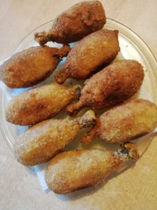 A csirkecombokat megtisztítjuk, lehúzzuk a bőrét és sós vízben oda tesszük főni. /én tettem hozzá leveszöldséget/. A burgonyát jól megtisztítva, Héjában megfőzzük. Amikor a hús már jön le a csontról, kiszedjük a /levéből lehet leves/. Kicsontozzuk a húst, apróra tépkedjük, a csontokat eltesszük félre. A krumplit összetörjük, és a húshoz adjuk, beleütjük a tojást, hozzá adjuk a reszelt sajtot. A fokhagymát, gyömbért apróra daraboljuk, a zöldhagymát, a hegyes zöldpaprikát felkarikázzuk, és hozzá adjuk a krumplis húshoz. Jól összedolgozzuk. Sózzuk, borsozzuk, kiskanál kurkumát adunk hozzá, és a tört pirospaprikát / frissen durvára tört szárított paprikát /. A kész keverékből nagyobb ökölnyi darabokat veszünk, hosszúkásra igazítjuk, és a csontot úgy tesszük bele, hogy kis combocskáknak látszódjanak. Jól össze kell nyomkodni, hogy ráragadjon a csontra. Lapostányérba tesszük a lisztet, a tojást egy mélyebb edénybe ütjük, jól kikeverjük kevés sóval, a pankómorzsát tálba öntjük / én erre egy mélyen kis tálat szoktam használni/ Lisztbe, tojásba, majd a pankómorzsába megforgatjuk a húsokat, bő, közepesen forró olajban sütjük. Papírtörlőre szedjük ki. Kínálhatunk mellé rizst, párolt zöldséget.
