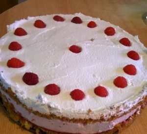 A zselatint beáztatjuk 9 kanál vízbe. A tejszínt a habfixálóval kemény habbá verjük, félre tesszük KB 1/3 –át, a többit a joghurttal elkeverjük. A megdagadt zselatint gőz fölött felolvasztjuk, hozzá keverünk két kanál krémet, majd jól elkeverjük a többi krémmel. A krém felét az előkészített piskótára öntjük, rászórjuk a málnát, és betakarjuk a többi krémmel. A másik piskóta lapot is megkenjük lekvárral, és a krémre borítjuk. A tetejét a félre tett tejszínnel bevonjuk, és málnaszemekkel díszítjük. Hűtőbe téve pár órát /egy éjszakát/ hűtjük.